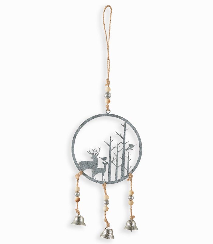 Suspension ronde en métal argenté ajouré décor cerfs et sapin avec grelots en suspension