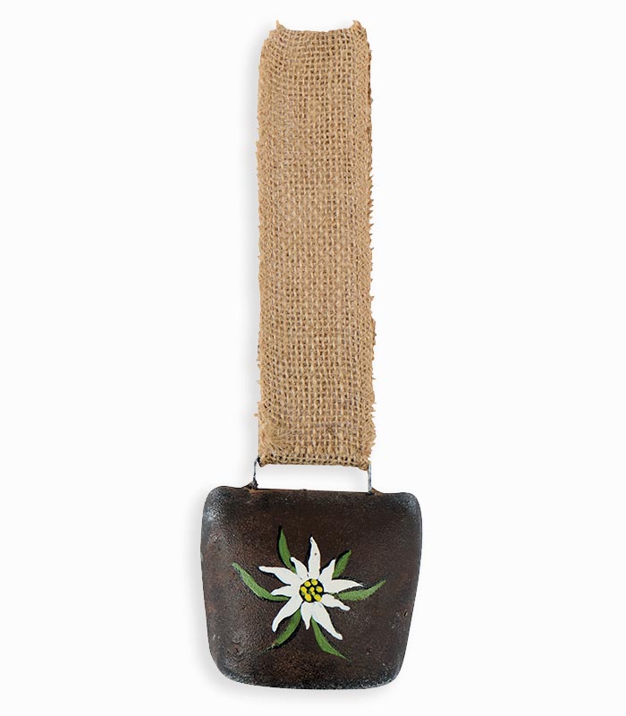 Grosse cloche en métal vieilli avec edelweiss blanc à suspendre