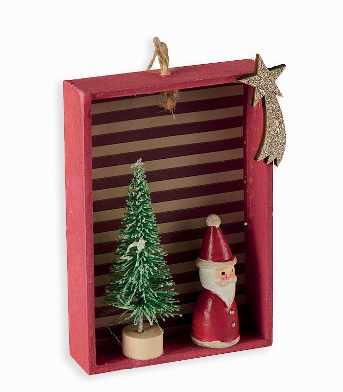 Suspension en MDF et résine de couleur rouge représentant le Père Noël avec sapin et étoile filante.