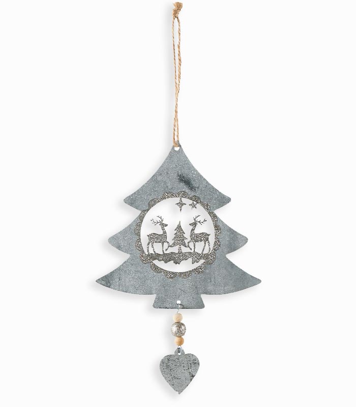 Suspension en forme de sapin gris et argenté en métal ajouré décor cerfs et sapin avec cœur en suspension