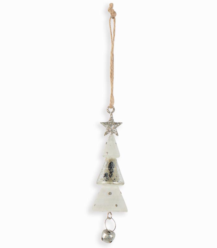 Suspension sapin blanc en bois avec étoile argentée et grelot