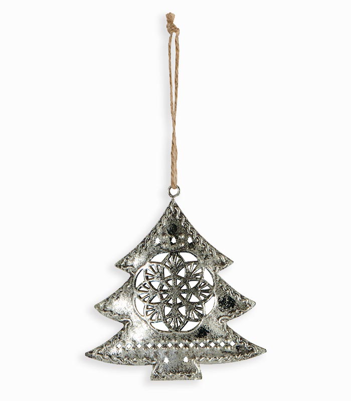 Sapin de Noël en métal argenté motifs ajourés à suspendre