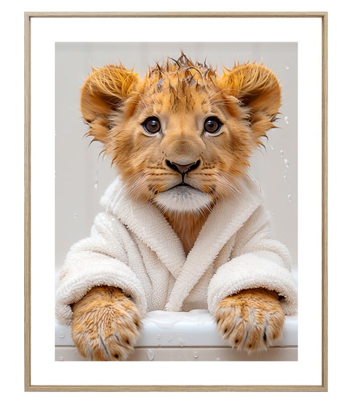 Toile et cadre en plastique, avec un bébé lion en peignoir.