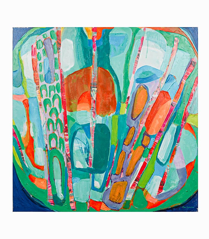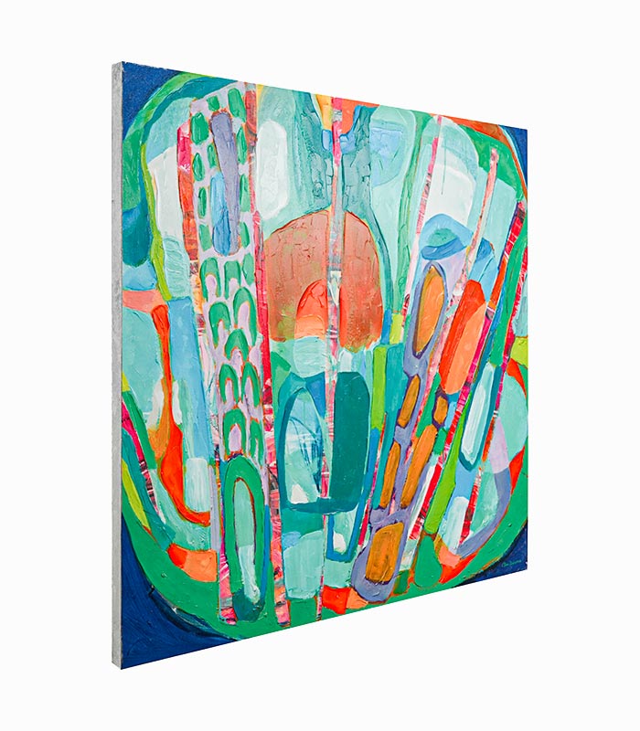 Toile abstraite peinte à la main avec bordure argentée. Ce tableau est réalisé par l’artiste Canadienne Claire DESJARDINS.