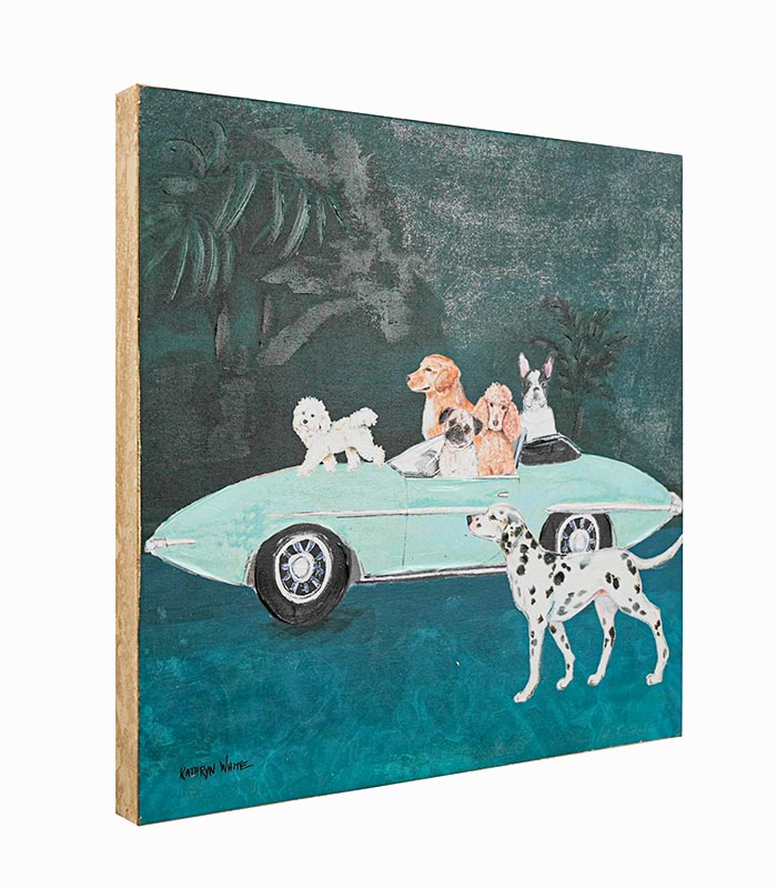 Toile peinte à la main sur des chiens à bord d’une voiture de sport. Ce tableau est réalisé par l’artiste Américaine Kathryn WHITE.