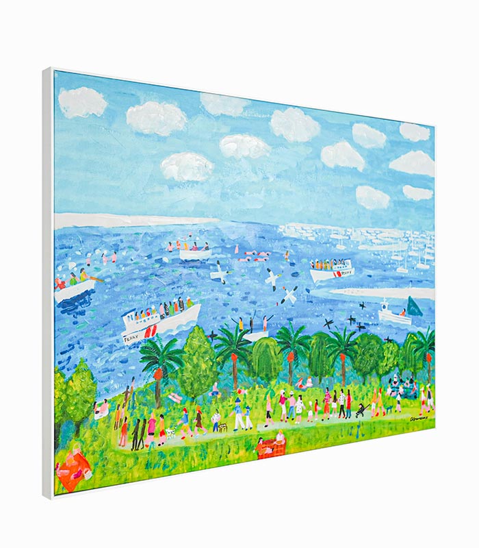 Toile peinte à la main avec cadre blanc représentant des promeneurs au bord de la mer. Ce tableau est réalisé par l’artiste Européen Alan FURNEAUXX.